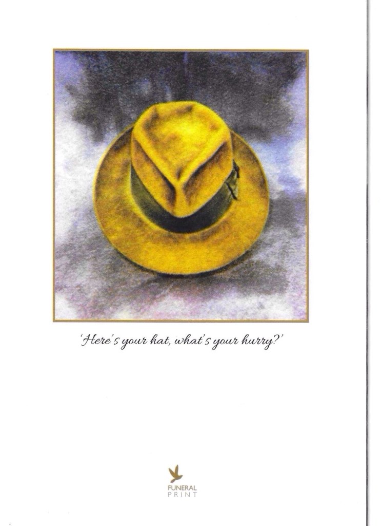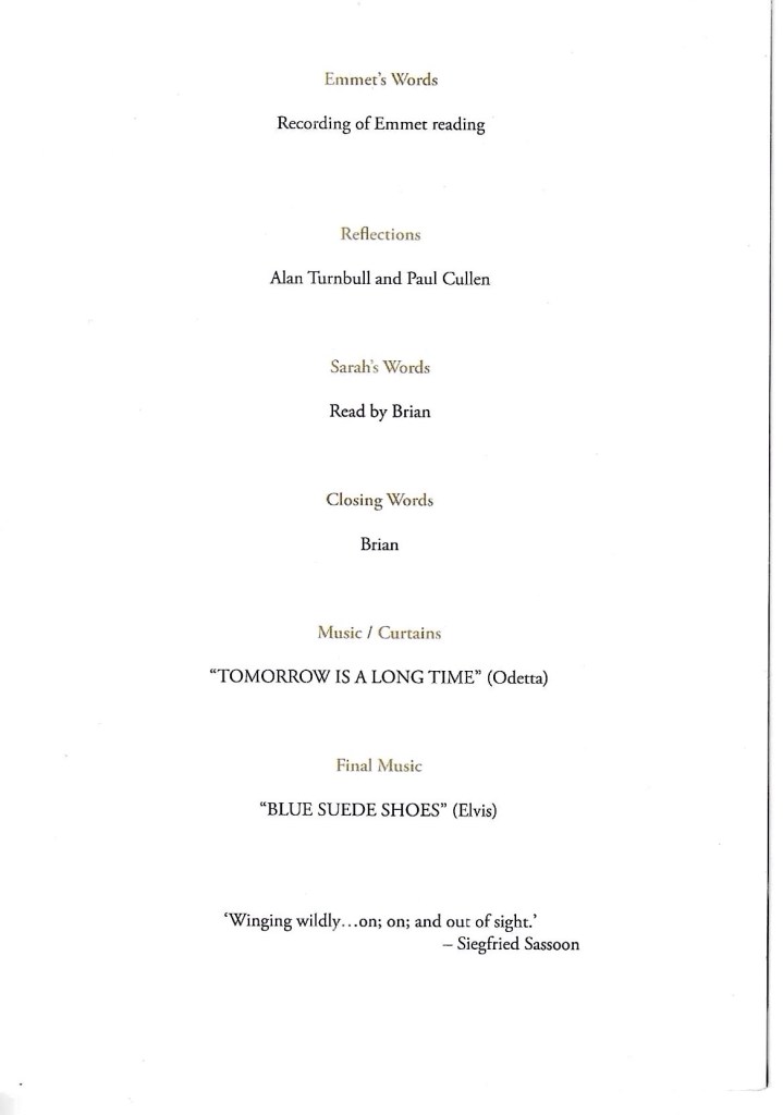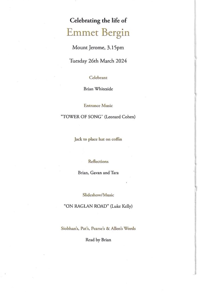 Tommy Mulloy and Johnny Murray represented the PPU at Emmet’s Funeral Service at Mount Jerome on Tuesday March 26th. Johnny passed me on the Service Booklet and it is reproduced below for the benefit of those of us who could not make it Mount Jerome on the day.