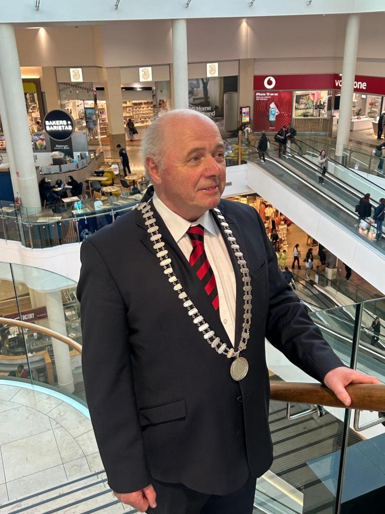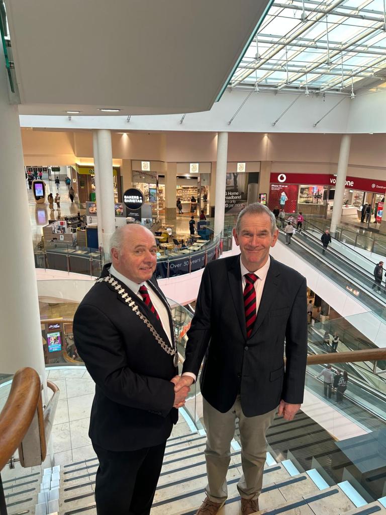 Pat, wearing the famous chain of office of President. Photo taken in Dundrum Shopping Centre where Pat works as Security Manager.)Outgoing President Dan Ferrari (class of 1973) presenting the chain to Pat.